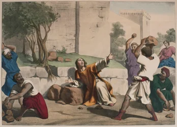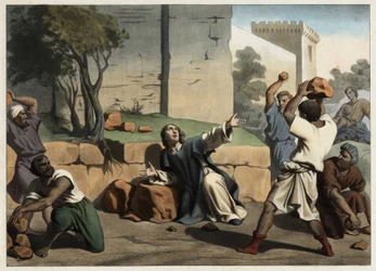 La muerte de San Esteban: San Esteban apedreado por los judíos es considerado el primer mártir cristiano. Grabado anónimo de mediados del siglo XIX.(The death of Saint Stephen: Saint Stephen stoned by the Jews is considered the first Christian martyr. Anonymous engraving from the middle of the 19th century.)Unknown artist |